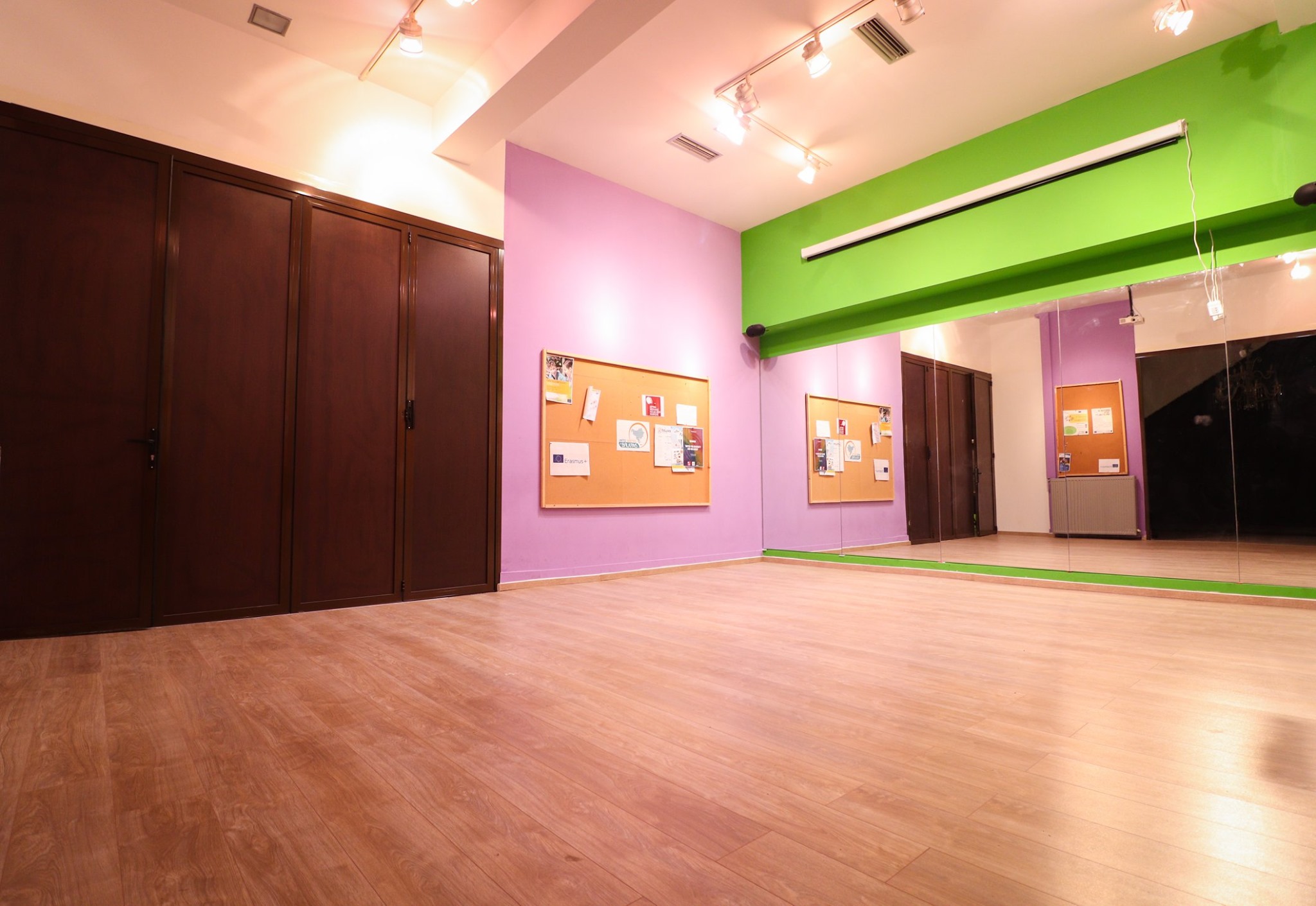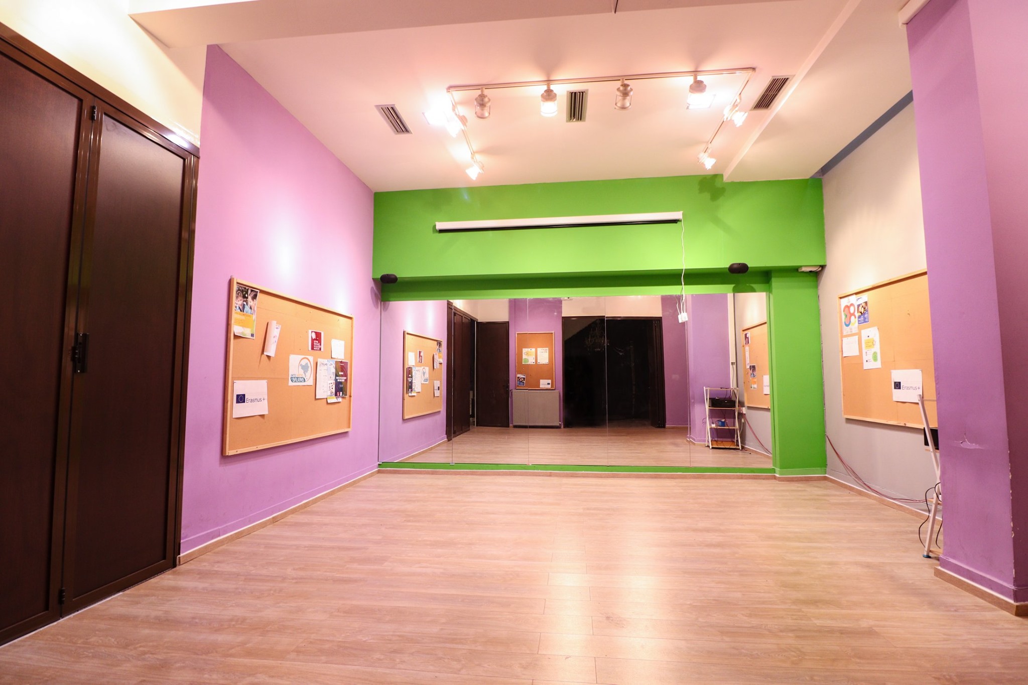 Μεγάλοι πάγκοι εργασίας για εργαστήρια που σχετίζονται με κατασκευές ή χειροτεχνίες. Ξύλινο πάτωμα, μοκέτα και μεγάλοι καθρέφτες, ιδανικά για θεατρικές και χορευτικές ομάδες